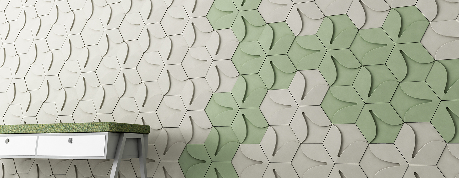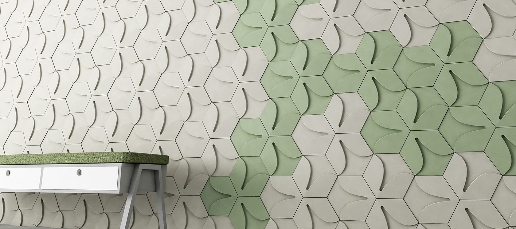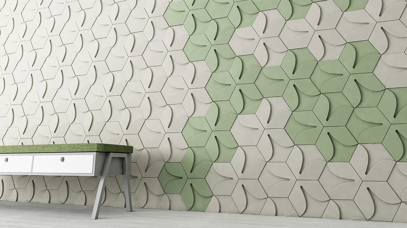This collection is the reconsideration of the symbol of 3 little leaves branching out from one stalk, creating a pure and modern visual conception. The playful yet simple lines and the 3D arrangement envision the image of a tidy field of clovers. Laying the tiles of the collection on a smaller surface recalls the luxury of nature’s organic symmetry.