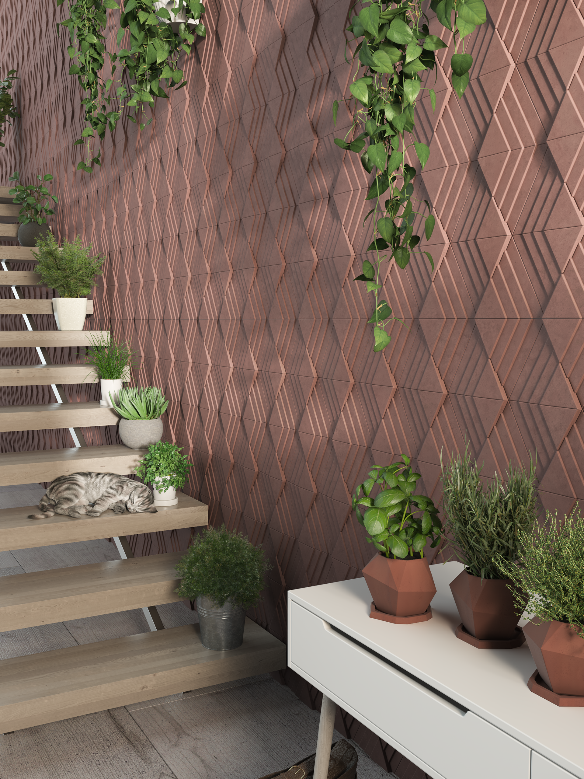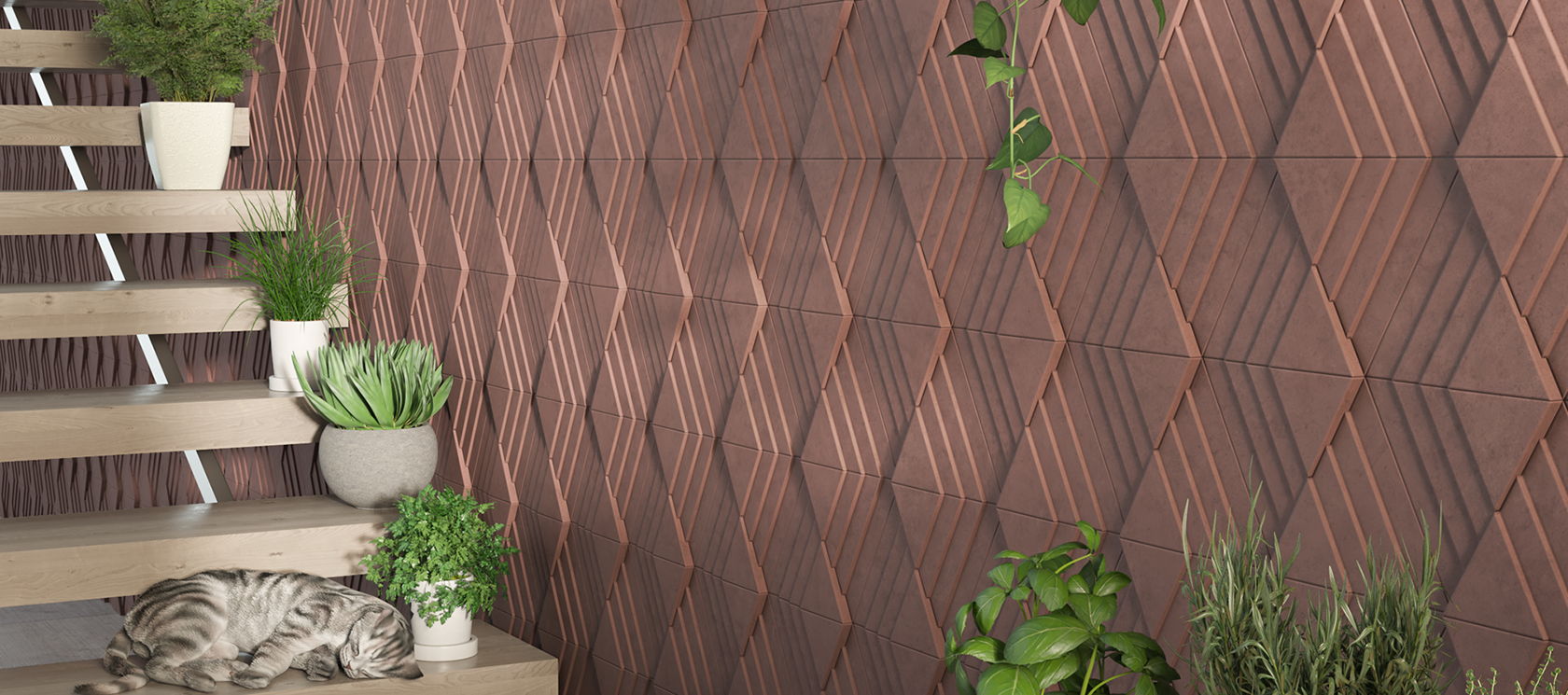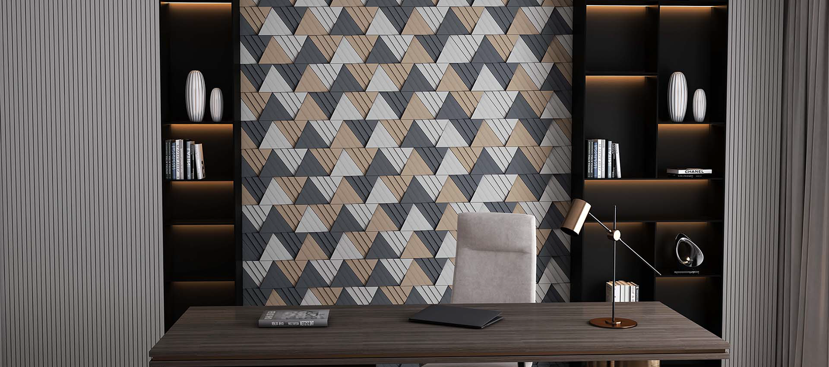 The collection of UP AND DOWN gives great alternatives of the layout. The pulsing of the rhombuses gives dynamics to the surface, while the strict lines provide the atmosphere of an orderly unit. This 3D collection has a symmetric rhythm which gives exclusive atmosphere for large surfaces but it can also create the focus applied in smaller areas.
